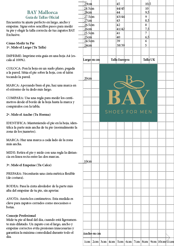 Nuestro tallaje es único: Ten en cuenta que nuestras hormas son propias de BAY. Confía en esta guía oficial, ya que es la más precisa para nuestro calzado.